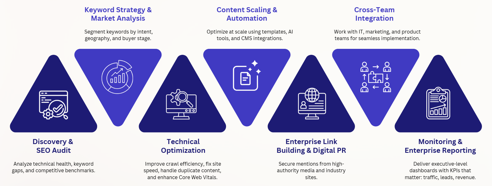 SEO aligned with enterprise-level KPIs like revenue and market share.